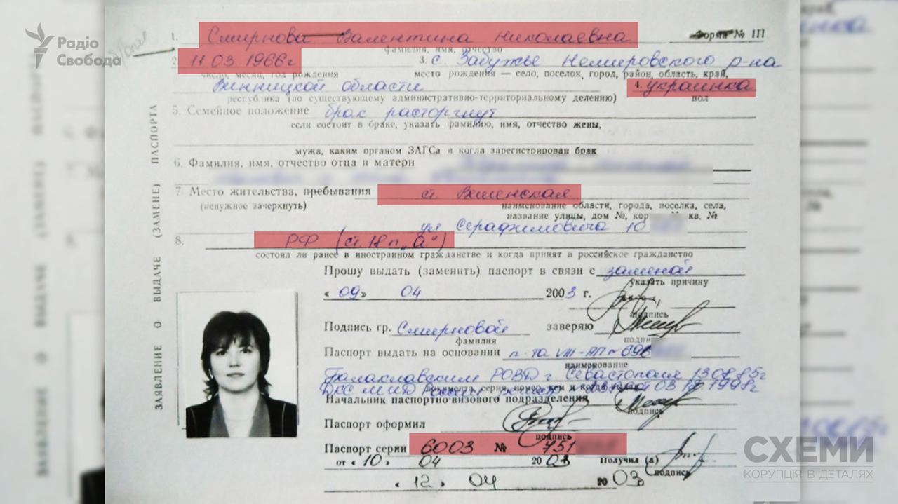 У судді Верховного суду України Валентини Сімоненко, яка подала у відставку в березні цього року, знайшли російський паспорт. Вона набула громадянство РФ ще в квітні 2003-го, коли мала прізвище Смірнова, пише проєкт “Схеми” з посиланням на витяг з "Роспаспорту".