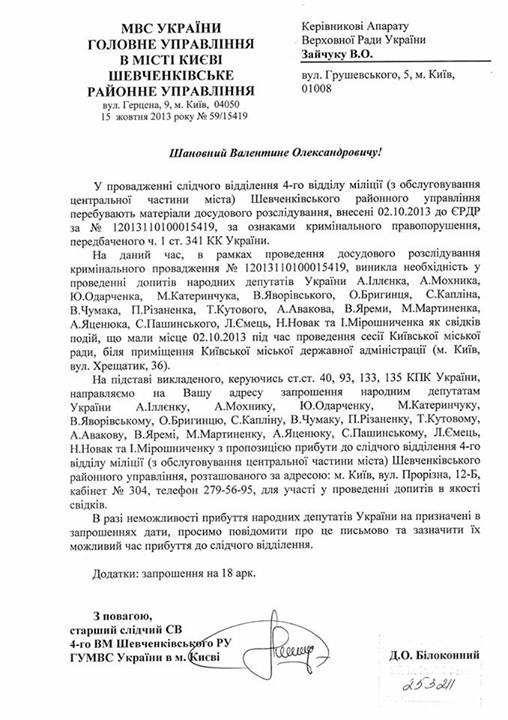 Згідно з документом, депутатів на допит в четвертий відділ Шевченківського районного управління ГУ МВС в Києві викликають у якості "свідків подій, які мали місце 2.10.2013 під час проведення сесії Київської міської ради, біля приміщення Київської міської державної адміністрації".