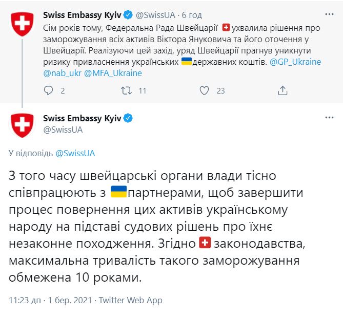 “Сім років тому, Федеральна Рада Швейцарії ухвалила рішення про заморожування всіх активів Віктора Януковича та його оточення у Швейцарії. Реалізуючи цей захід, уряд Швейцарії прагнув уникнути ризику привласнення українських державних коштів”, - повідомило посольство у Twitter.
