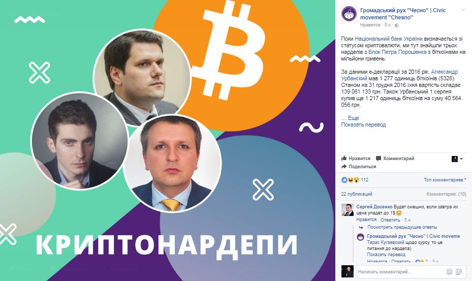 Як повідомляє рух у Facebook, за даними е-декларації за 2016 рік, народний депутат Олександр Урбанський володіє 1227 одиницями біткоїнів (5328). Станом на 31 грудня 2016 року їх вартість становила 139 081 133 грн. 1 серпня Урбанський докупив ще 1217 одиниць біткоїнів на суму 40 564 056 грн.