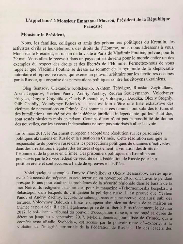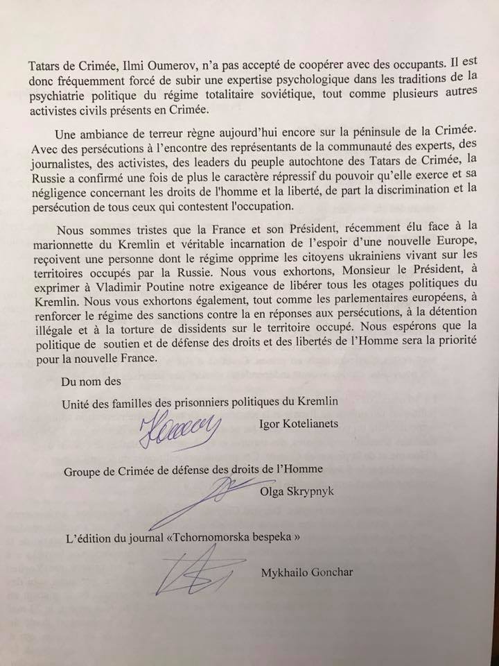 "Закликаємо Вас, пане Президенте, відверто висловити Володимиру Путіну нашу вимогу звільнення усіх політичних бранців Кремля. Також, слідом за європейськими парламентарями, закликаємо Вас посилити режим санкцій проти Росії за переслідування, незаконне утримання під вартою та катування інакодумців на окупованих територіях. Сподіваємось, що для нової Франції політика підтримки та захисту прав і свобод людини буде пріоритетною", – підсумовують автори листа.