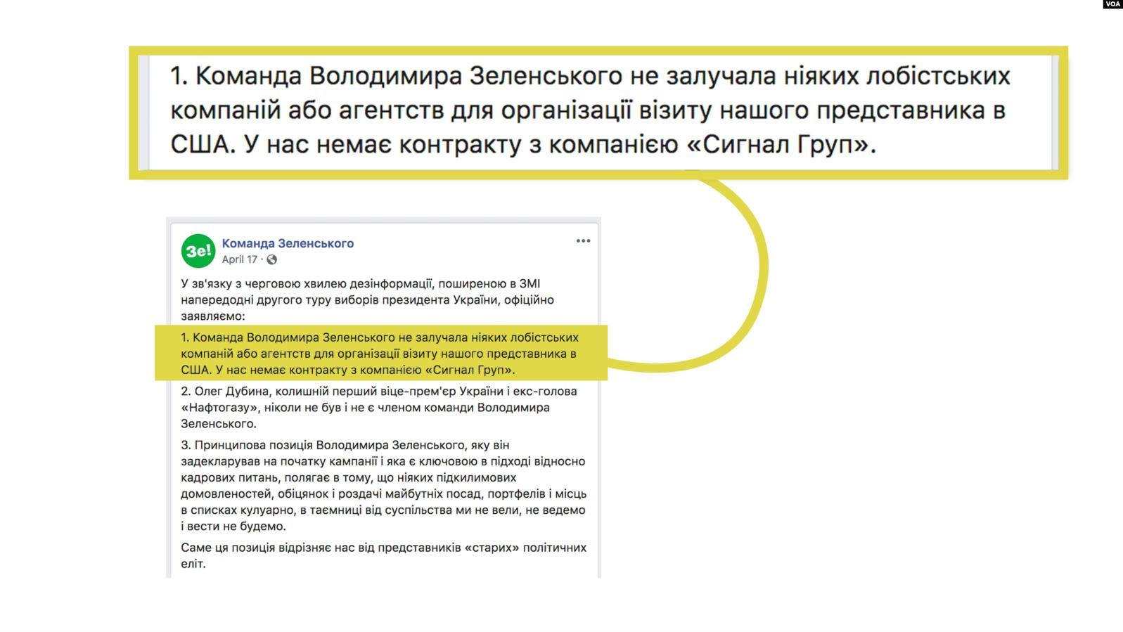 "Команда Володимира Зеленського не залучала жодних лобістських компаній або агентств для організації візиту нашого представника до США. У нас немає контракту із "Сигнал Груп", - йдеться в заяві, опублікованій на сторінці "Команди Зеленського" в Facebook 17 квітня.