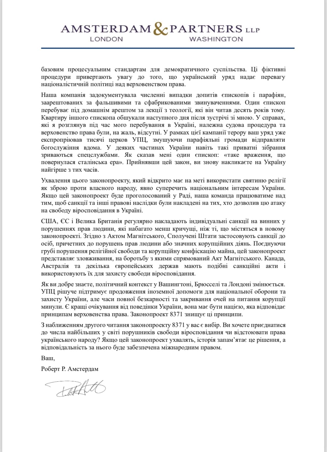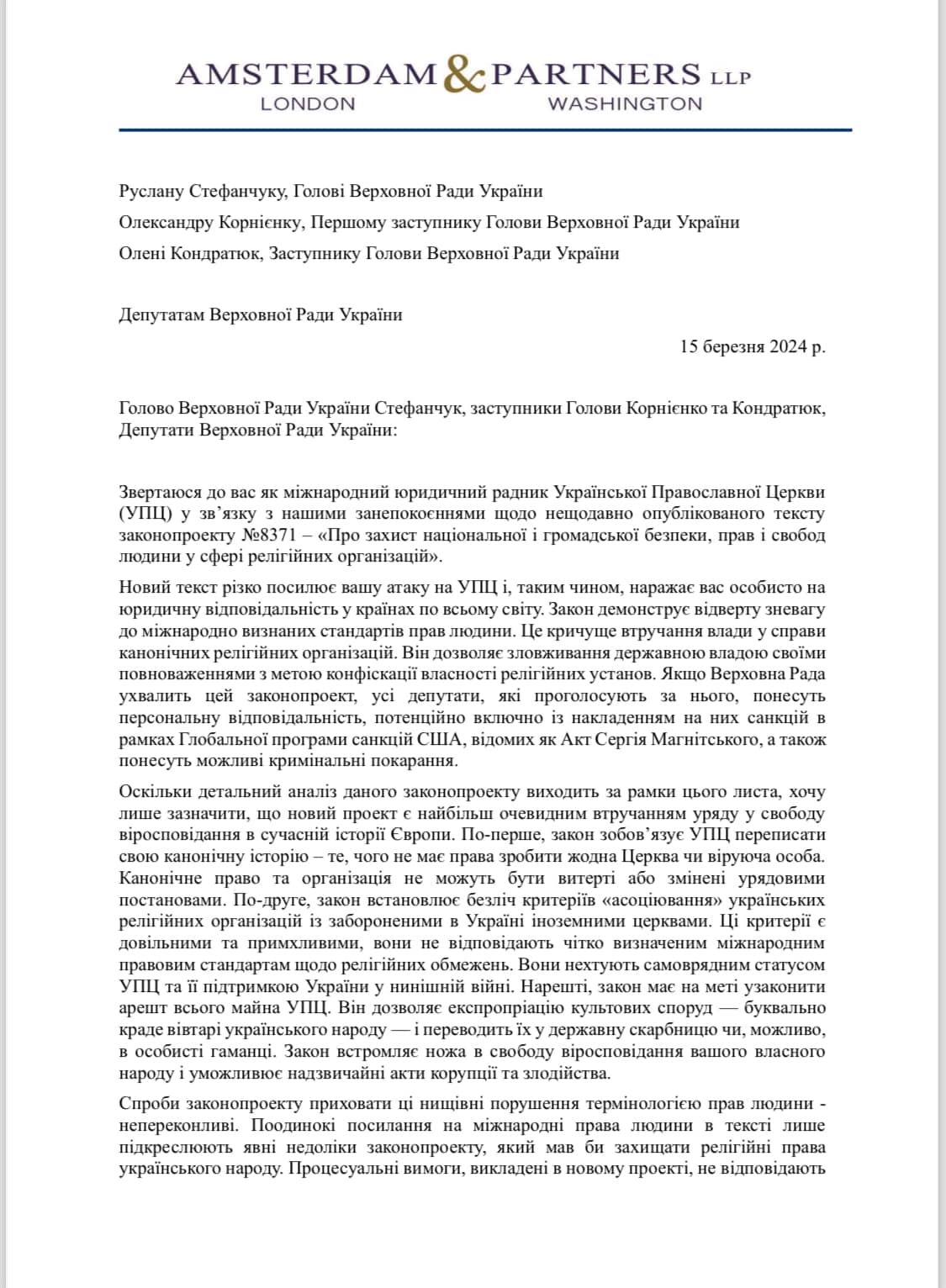 Напередодні видання LB.ua опублікувало копію листа на ім’я спікера Верховної Ради Руслана Стефанчука та його заступників Олександра Корнієнка і Олени Кондратюк, у якому значиться, що «якщо цей закон (№8371, про заборону діяльності релігійних організацій із керівним центром на території рф — ред.) буде проголосований у Раді, наша команда працюватиме над тим, щоб санкції та інші правові наслідки були накладені на тих, хто дозволив атаку на свободу віросповідання в Україні».