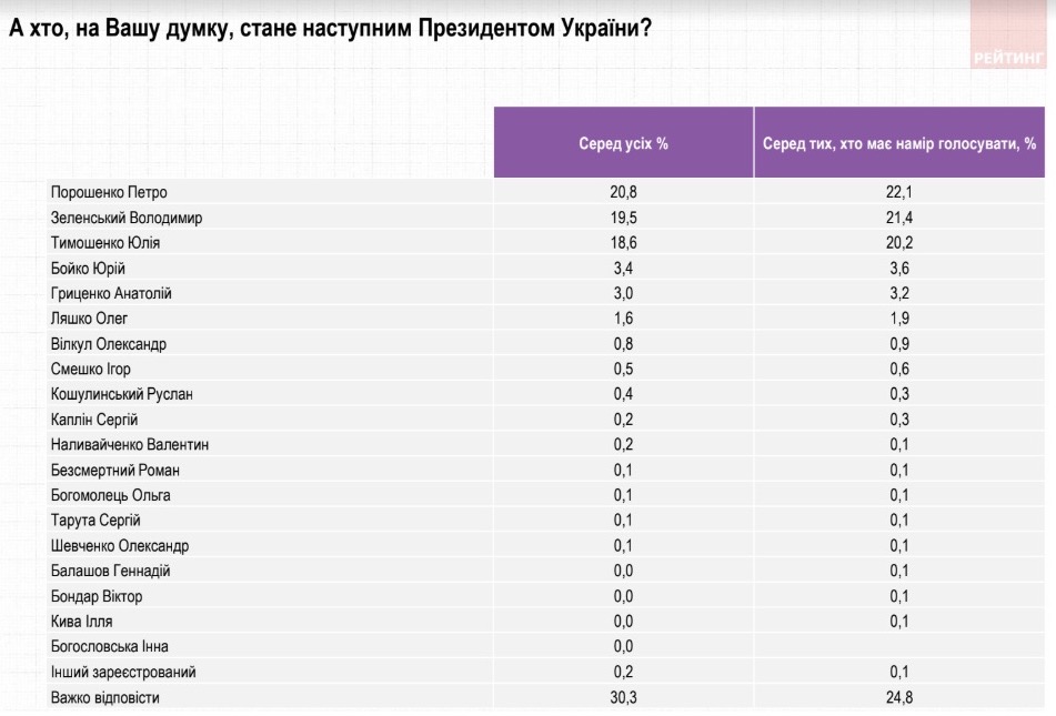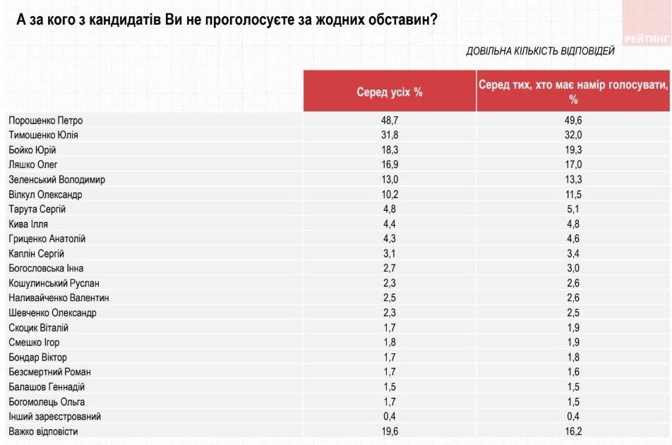 За лідера партії "Батьківщина" Юлію Тимошенко не віддали б свої голоси 32%, за кандидата від "Опозиційної платформи – За життя" Юрія Бойка – 19,3%, за лідера Радикальної партії Олега Ляшка - 17%, за шоумена Володимира Зеленського – 13,3%, за кандидата від "Опозиційного блоку" Олександра Вілкула – 11,5%.