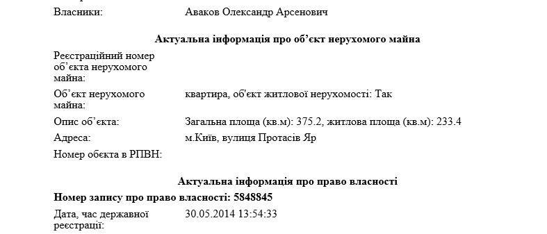 За даними Єдиного реєстру нерухомого майна, у Авакова-молодшого є квартира в районі станції метро "Олімпійська" площею 375,2 квадратних метрів з місцями у підземному паркінгу.