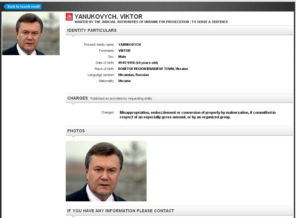Офіційний запит в Інтерпол у справі Януковича і його найближчих соратників Україна направила ще в березні 2014 року.