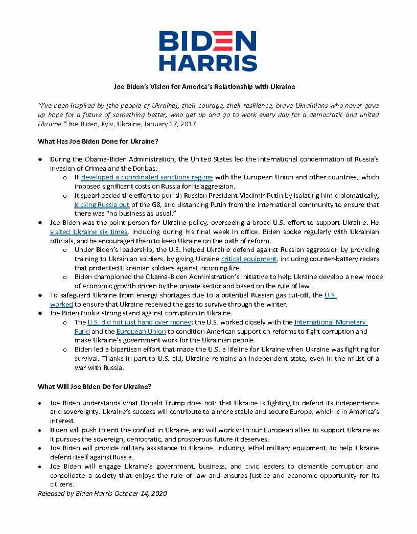 "Джо Байден розуміє, що Дональд Трамп не розуміє: що Україна бореться за відстоювання своєї незалежності та суверенітету; що успіх України буде внеском у стабільність і безпеку Європи, що своєю чергою є інтересом США. Байден наполягатиме на закінчення конфлікту в Україні та працюючи з європейськими партнерами в підтримці України, яка прагне захистити свій суверенітет, демократію та світле майбутнє, на яке вона заслуговує", - йдеться в" Видіння Джо Байдена відносин США з Україною ".