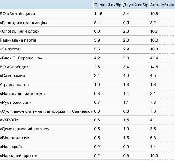 Як зазначається в повідомленні КМІС, з цих партій більше, ніж інші, враховуючи статистичну похибку, має ВО "Батьківщина". На другому місці – "Громадянська позиція" (тобто враховуючи похибку, партія набирає менше, ніж ВО "Батьківщина", але більше – ніж інші партії). Наступні три партії ("Опозиційний блок", Радикальна партія, "За життя") мають підтримку, яка відрізняється практично в рамках похибки, тобто ці політичні скоріше "ділять" третє місце. Далі після них іде "Блок Петра Порошенка".