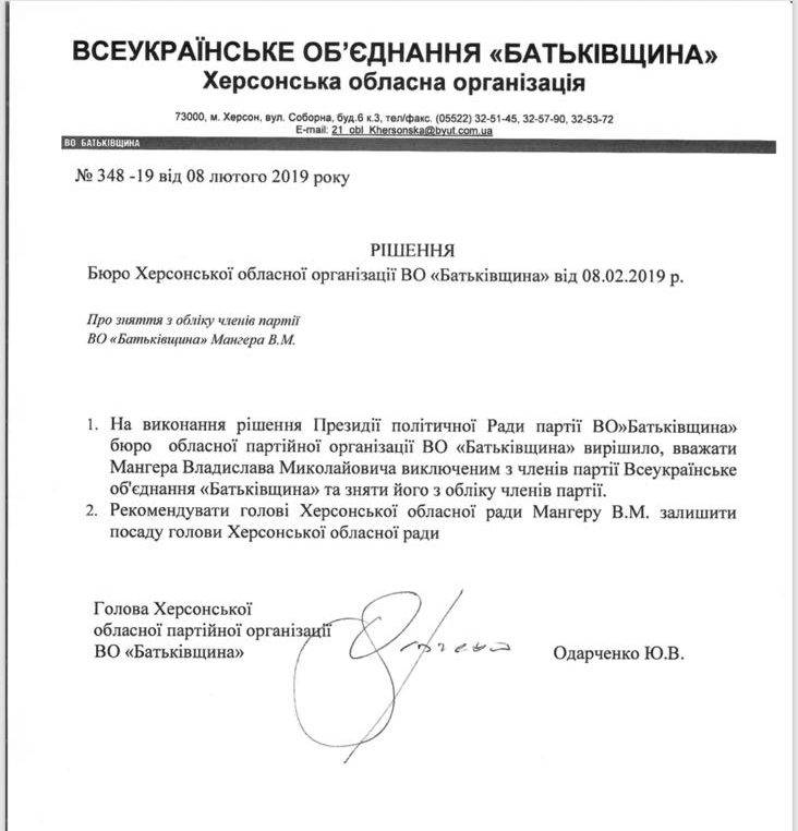 Згідно з прийнятим політсилою рішенням, Мангеру, крім виключення, також радять скласти повноваження голови Херсонської облради.