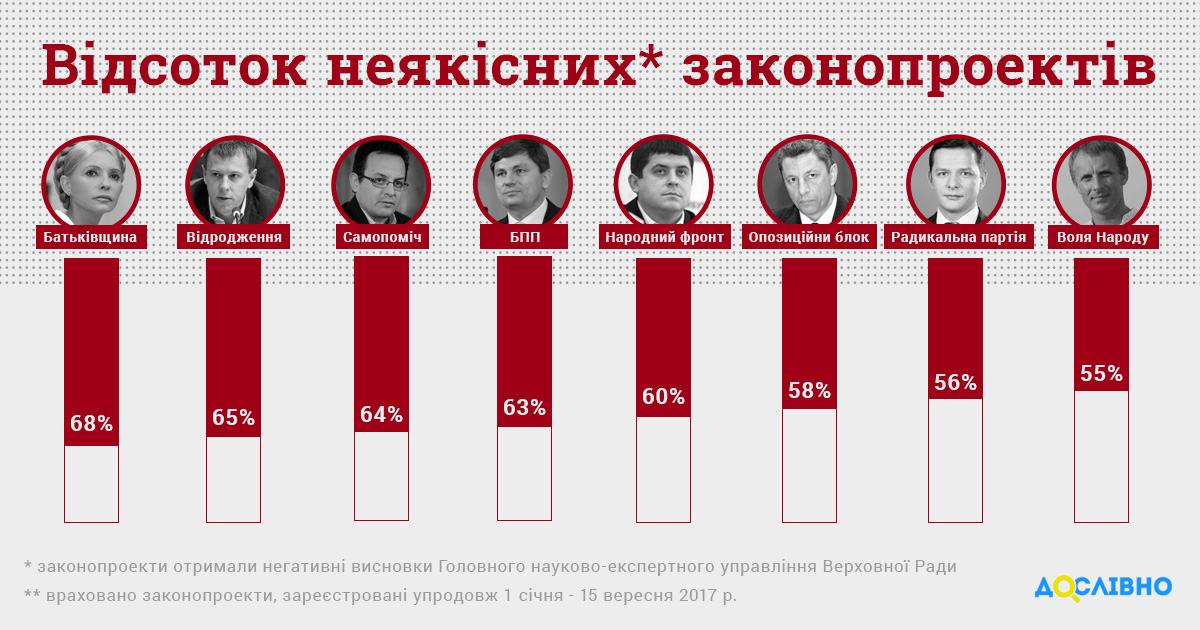 Загалом ГНЕУ було надано негативні висновки щодо 68% законопроектів "Батьківщини", зареєстрованих впродовж 2017 року (з 1 січня по 15 вересня). Із 60 ініціатив 41 було рекомендовано повернути на доопрацювання чи відхилити. У групи "Відродження" цей показник склав 65% (26 із 40 законопроектів отримали негативні висновки управління). Щодо інших фракцій показники наступні: "Самопоміч" - 64% неякісних законопроектів (40 із 62), БПП – 63% (91 зі 143), НФ – 60% (63 із 105), Опоблок – 58% (20 із 34), РПЛ – 56% (31 із 55), Воля народу – 55% (19 із 34).