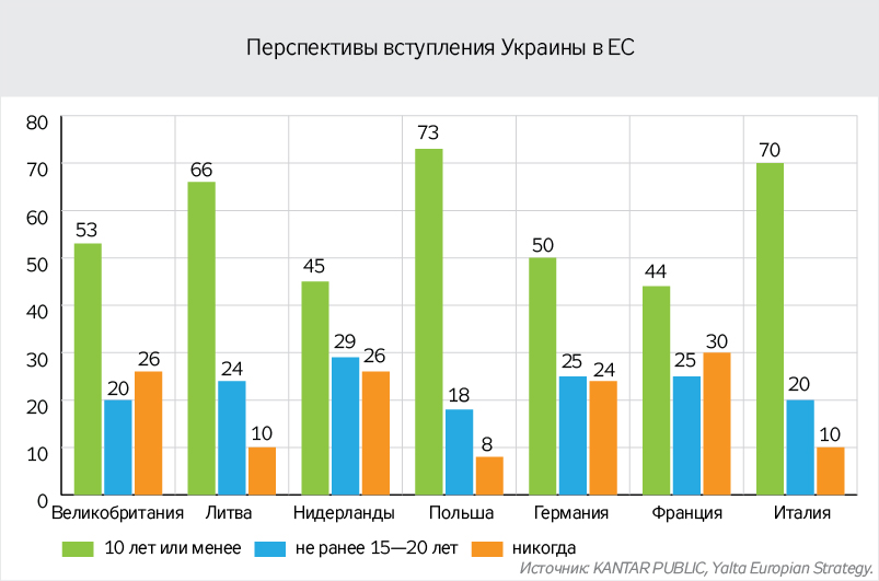 48% жителів Німеччини, Франції, Великобританії, Італії, Нідерландів, Польщі і Литви підтримують вступ України до Євросоюзу, а переважна більшість (79%) вважають, що Україна стане членом ЄС в найближчому майбутньому.