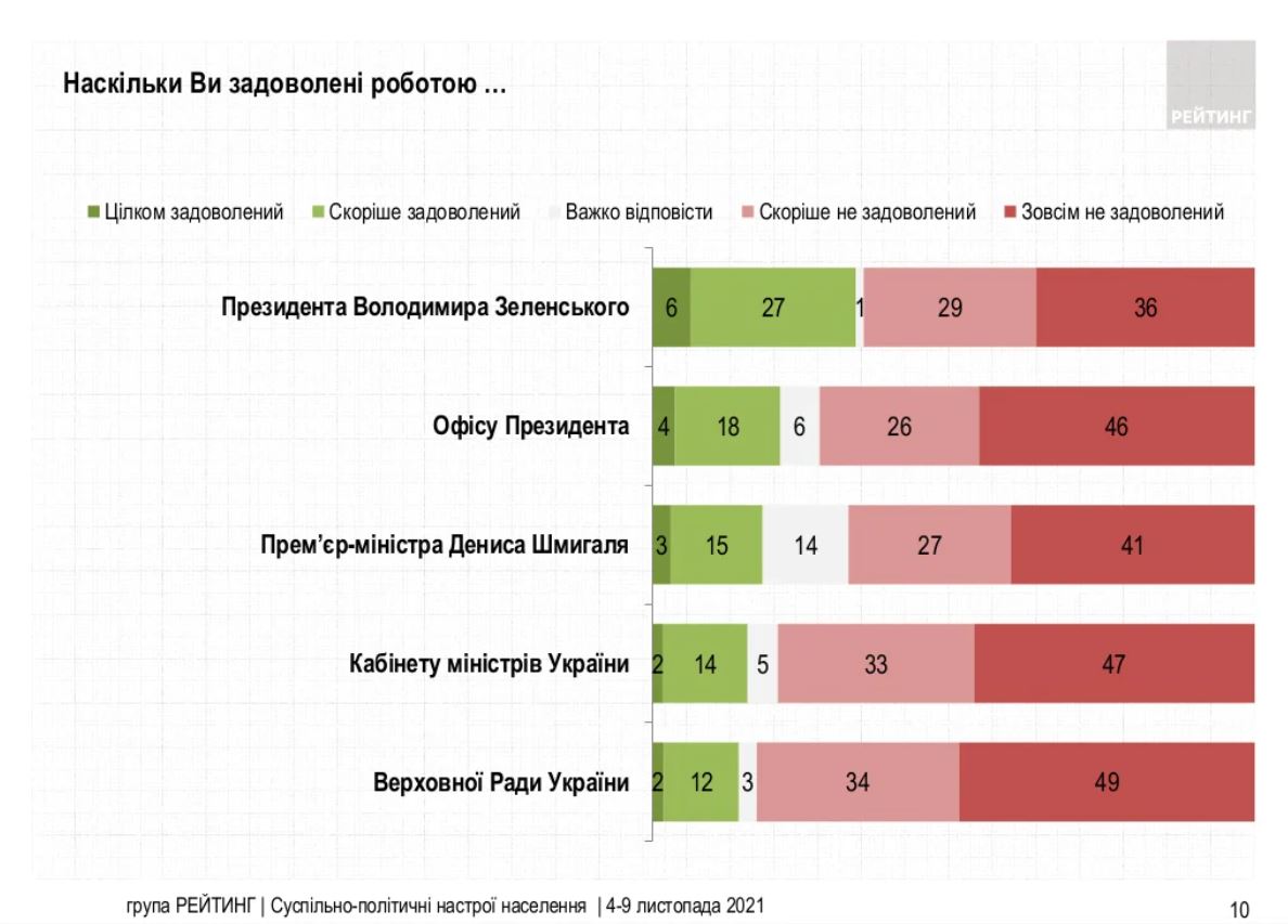 Якщо говорити про Офіс президента, то його роботою задоволені 22% громадян. Протилежної думки про діяльність ОПУ 72% українців.