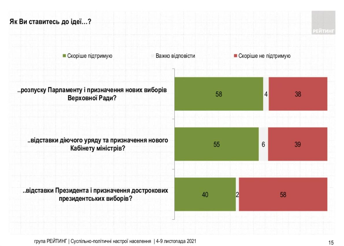 При цьому ідею розпуску українського парламенту та призначення нових виборів підтримують 58% респондентів. Проти цього виступили 38% громадян.