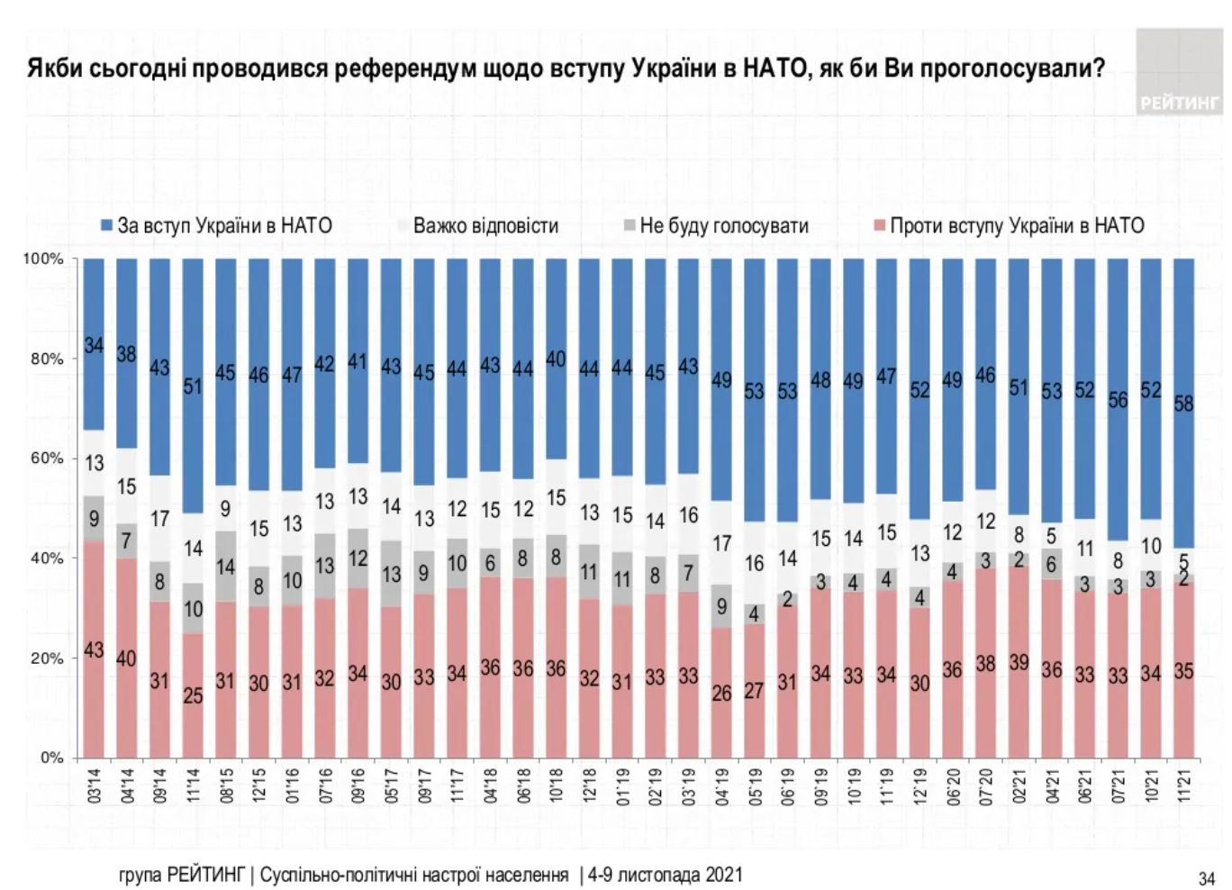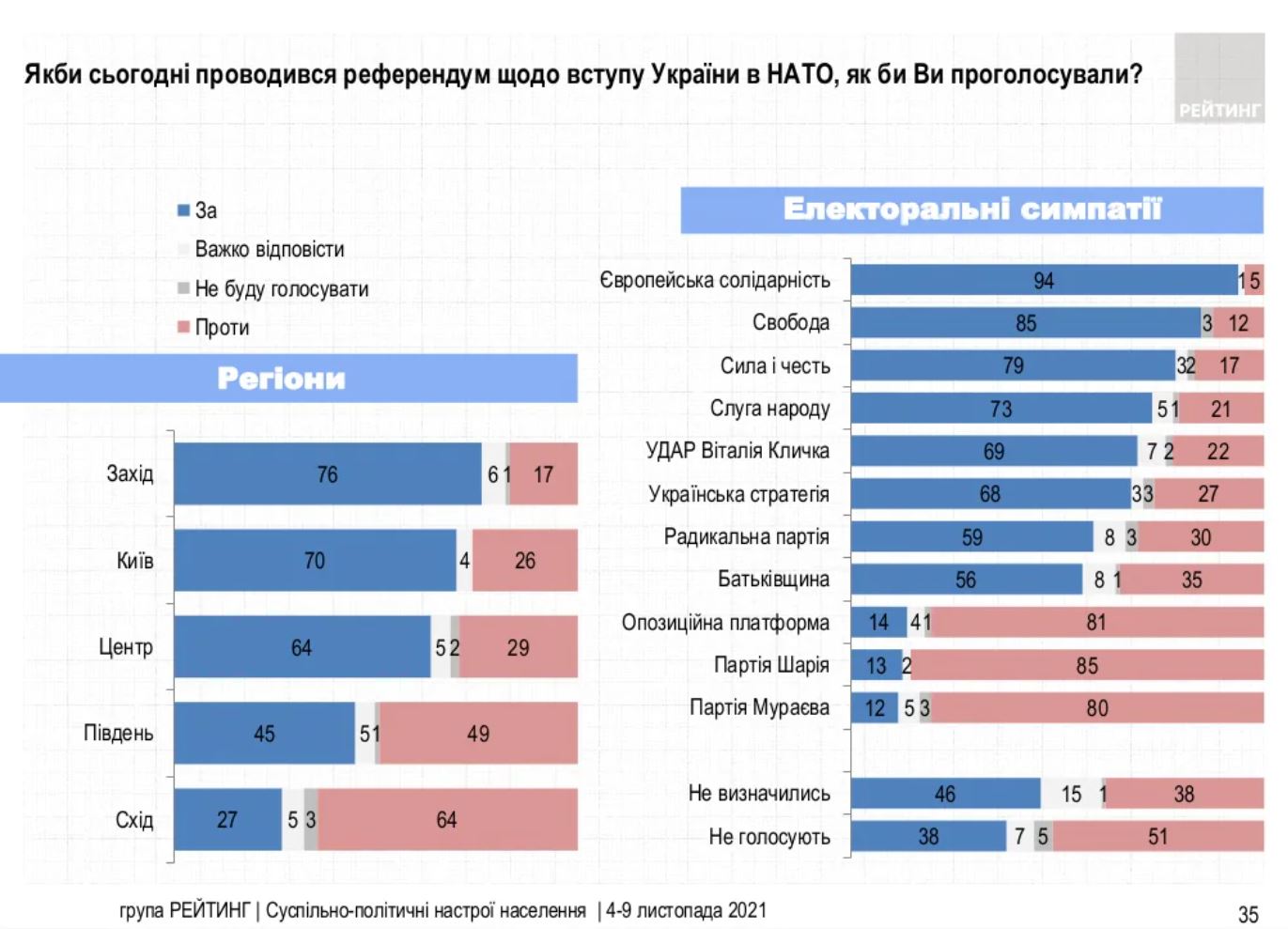 Водночас під час референдуму за вступ до НАТО «за» проголосували б 58% опитуваних. Проти цього виступають 35%.