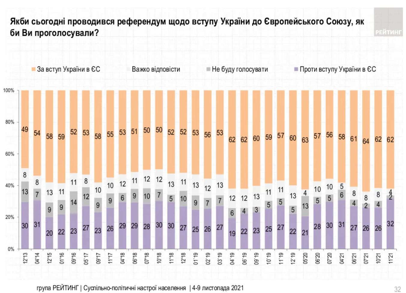 Якби сьогодні відбувався референдум про вступ України до Європейського Союзу, то свій голос «за» віддали б 62% громадян, йдеться у результатах опитування Соціологічної групи «Рейтинг». Не підтримали вступ України до ЄС 32% респондентів.