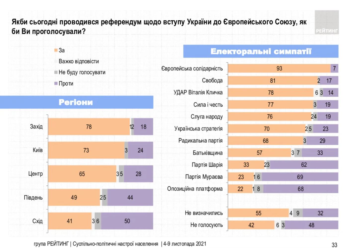 За даними соціологів, найбільш лояльні до євроінтеграції жителі західних та центральних областей. Водночас найменша прихильність у мешканців східних регіонів, де вступ України до ЄС та НАТО підтримують менше половини. Найбільш скептичні щодо приєднання до союзів виборці Опозиційної платформи, партій Шарія і Мураєва.