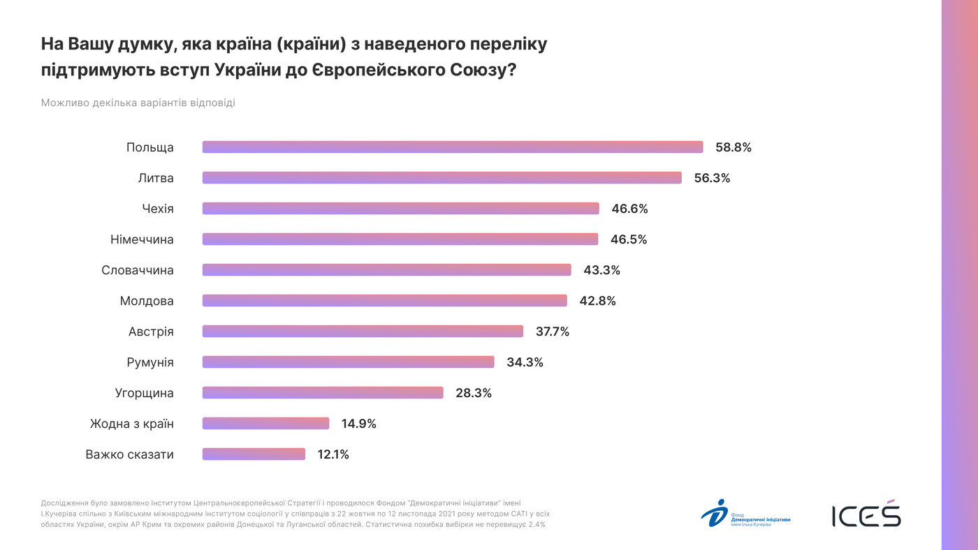 Водночас 59% опитаних відзначили зусилля Польщі щодо підтримки вступу України в Євросоюз, ще 56% те ж саме сказали про Литву. Про підтримку європейської інтеграції України з боку Німеччини зазначали 46,5% респондентів, з боку Словаччини – 43%, Румунії – 34%, Угорщини – 28%.