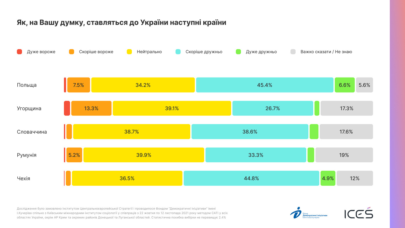 Більшість українців вважають, що сусідні держави Центральної Європи (Польща, Румунія, Словаччина та Чехія) ставляться до України переважно по-дружньому чи нейтрально. Про це йдеться у результатах опитування Фонд «Демократичні ініціативи» імені Ілька Кучеріва, проведеного спільно з Київським міжнародним інститутом соціології на замовлення Інституту центральноєвропейської стратегії.