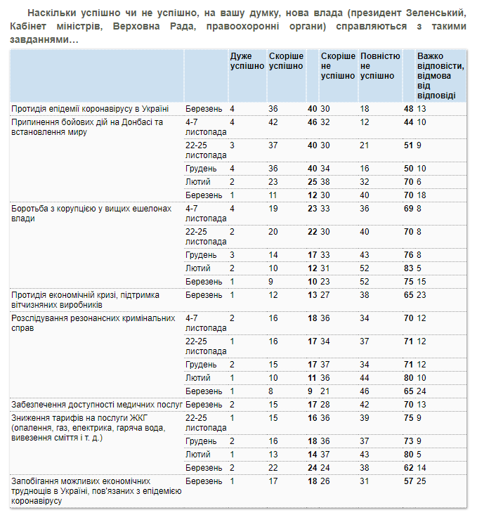 Більшість українців не вважає успішними зусилля влади у впровадженні реформ, протидії поширенню коронавірусу COVID-19 та боротьбі з російською агресією в Донбасі, свідчать дані свіжого опитування Київського міжнародного інституту соціології (КМІС).