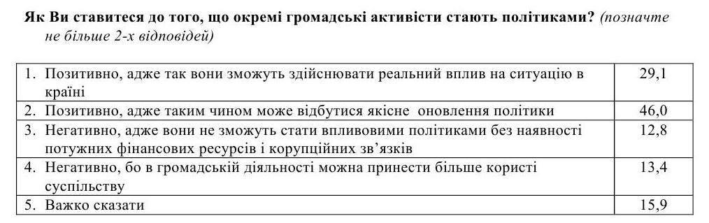 Більшість українців позитивно ставиться до того, що окремі громадські активісти стають політиками: 46% вважають, що саме так може відбутися якісне оновлення політики, а 29% певні, що серед участь у політиці громадські активісти зможуть здійснювати реальний вплив на ситуацію в країні, свідчать дані опитування фонду "Демократичні ініціативи" та Центру Разумкова.