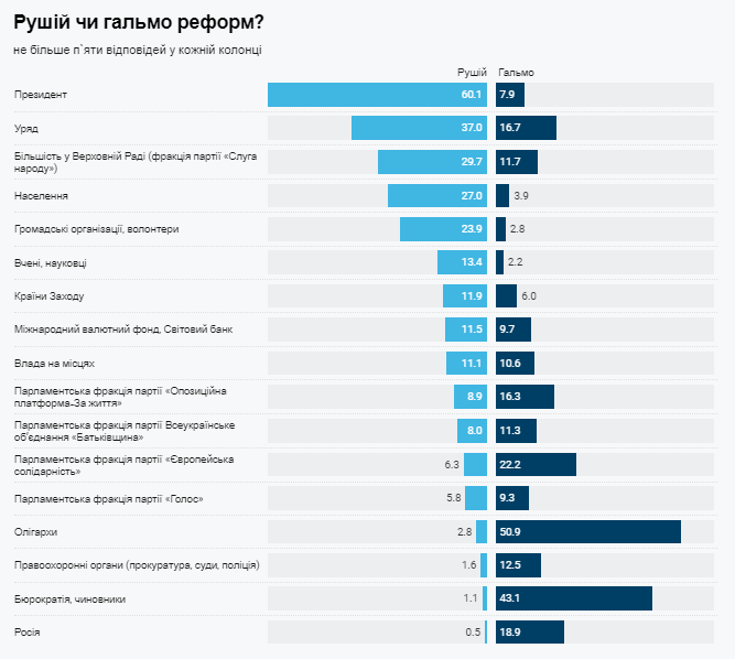 Найкращий баланс в оцінці громадянами ролі у проведенні реформ (тобто переважання в оцінках ролі рушія) виявився у президента (+52%), населення (+23%), громадських організацій, волонтерів (+21%), уряду (+20%), більшості у Верховній Раді (+18%). А найгірший баланс у визначенні "рушії-гальма" в олігархів (–48%) та чиновників (–42%).