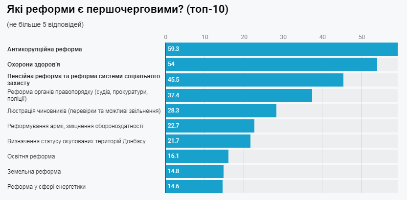 Найважливішою для України реформою майже 59% громадян вважають антикорупційну, минулого року таких українців було 58%. На друге місце за важливістю українці віднесли реформу сфери охорони здоров'я (54%, минулого року – 47%). За важливість пенсійної реформи та реформи системи соцзахисту висловилося 46% опитаних, минулого року таких українців було 44%. За реформу органів правопорядку висловилися 37%, минулого року – 32%. Ще 28% українців найважливішою назвали люстрацію чиновників, у минулого році таких було 29%. Важливість реформа армії, зміцнення обороноздатності підтримали 23%, минулого року – 22%.