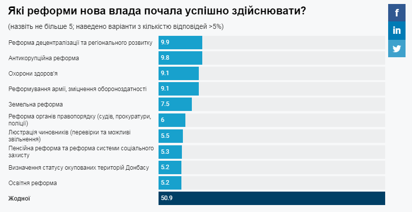 Зі всіх перелічених реформ відносно успішними визнали лише антикорупційну реформу (10%), децентралізації (10%), реформу охорони здоров'я (9%), реформування армії (9%) та земельну реформу (8%). Жодної успішної реформи не назвали 51% опитаних, торік таких українців був 41%.