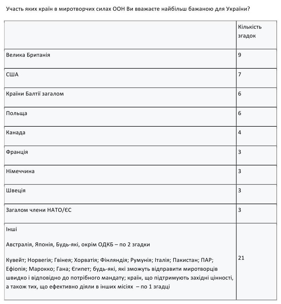 Найоптимальнішим для української сторони є участь у миротворчій операції представників Сполученого Королівства, Сполучених Штатів, а також Польщі та країн Балтії (передовсім Литви).