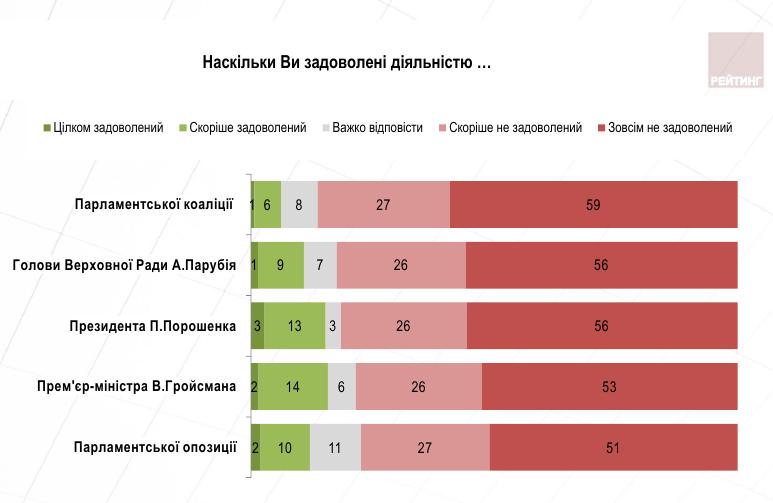 Нагадаємо, що згідно з опитуванням Соціологічної групи "Рейтинг", лише 6% українців задоволені роботою парламентської коаліції, 86% - не задоволені.