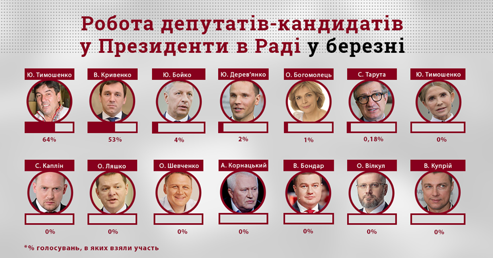 Зазначено, що 8 із 14 депутатів, які братимуть участь у президентських виборах, не проголосували в березні жодного разу. Серед таких кандидатів Юлія Тимошенко, Олександр Шевченко, Олександр Вілкул, Сергій Каплін, Олег Ляшко, Аркадій Корнацький, Віктор Бондар та Віталій Купрій.