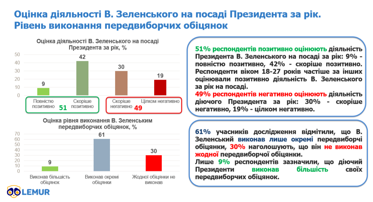 Дії Володимира Зеленського за перший рік його президентства позитивно оцінюють 51% громадян, йдеться у результатах опитування, проведеного "Нью Імідж Маркетинг Груп" на базі додатку Lemur. Серед таких респондентів 9% вказали, що повністю позитивно оцінюють дії Зеленського, що 42% - скоріше позитивно.