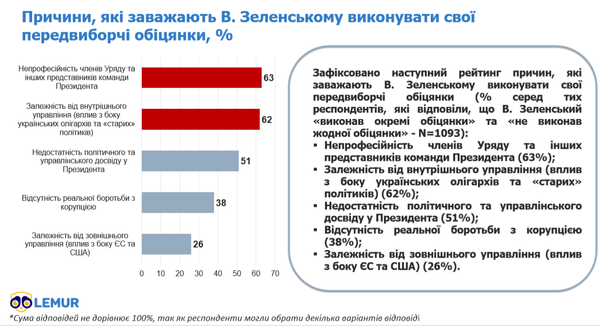 Так, 63% опитаних вважають, що виконувати Зеленському обіцянки заважає непрофесійність членів уряду та інших представників команди президента. Ще 62% причиною цьому назвали залежність від внутрішнього управління, зокрема, вплив з боку українських олігархів та "старих" політиків. На думку 51% українців, президент не може виконати власних обіцянок через недостатність політичного та управлінського досвіду в нього. Відсутність реальної боротьби з корупцією вважають причиною 38% опитаних, а залежність від зовнішнього управління з боку ЄС та США - 26% респондентів.