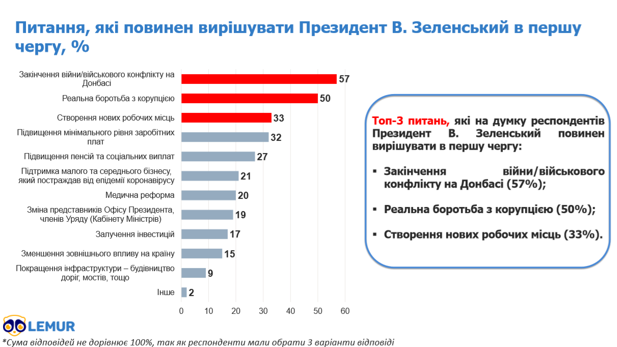 При цьому, 57% громадян впевнені, що у першу чергу президент повинен вирішувати питання щодо закінчення війни в Донбасі. Ще 50% вважають першочерговим питання реальної боротьби з корупцією в Україні, а 33% - створення нових робочих місць.