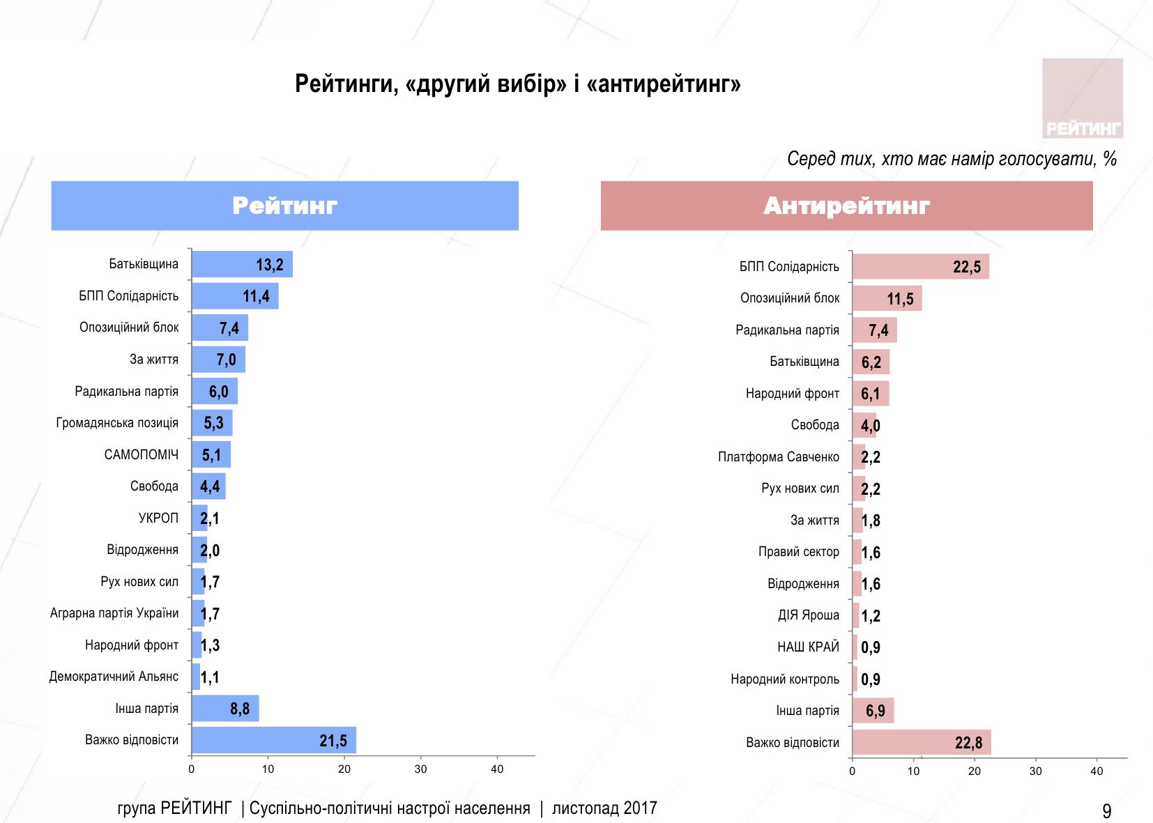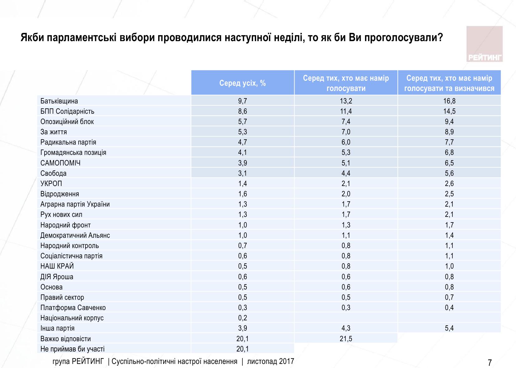 Серед тих, хто має намір взяти участь у голосуванні, 9,4% підтримують партію "Опозиційний блок", 8,9% - партію "За життя", 7,7% - "Радикальну партію", 6,8% - "Громадянську позицію", 6,5% - "Самопоміч", 5,6% - партію "Свобода". Рейтинг інших партій нижче 3%.