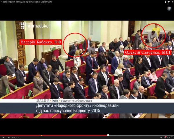 З розкадровки видно, що в ході голосування за бюджет депутат від "Народного фронту" Валерій Бабенко проголосував відразу за трьох депутатів, депутат від "БПП" Олексій Савченко - за двох (за себе в передостанньому ряду і праве місце під балконом в останньому ряду).