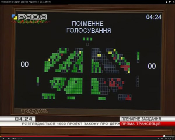 29 грудня Верховна Рада ухвалила держбюджет на 2015 рік. За рішення проголосувало 233 депутати ВР з 226 мінімально необхідних.