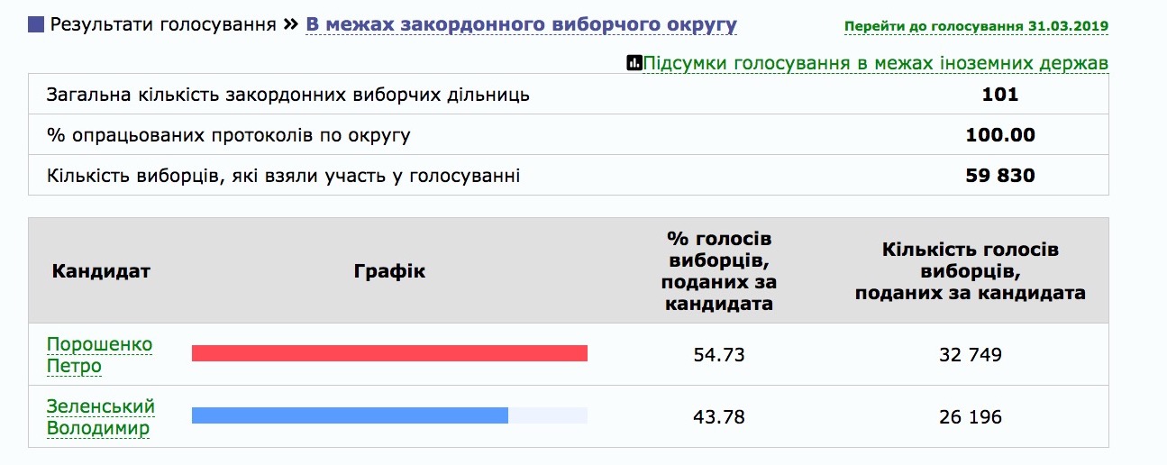 За даними ЦВК, Порошенко отримав більшість голосів у 45 із 72 країн. За нього проголосували 32 тисячі 749 українців. Зеленський отримав більше голосів у 24 країнах. За нього віддали свої голоси 26 тисяч 196 виборців. У трьох країнах голоси українців розподілилися між кандидатами порівну: по 49,2% в Алжирі, по 50% у Кувейті і по 48,52% у Чилі.