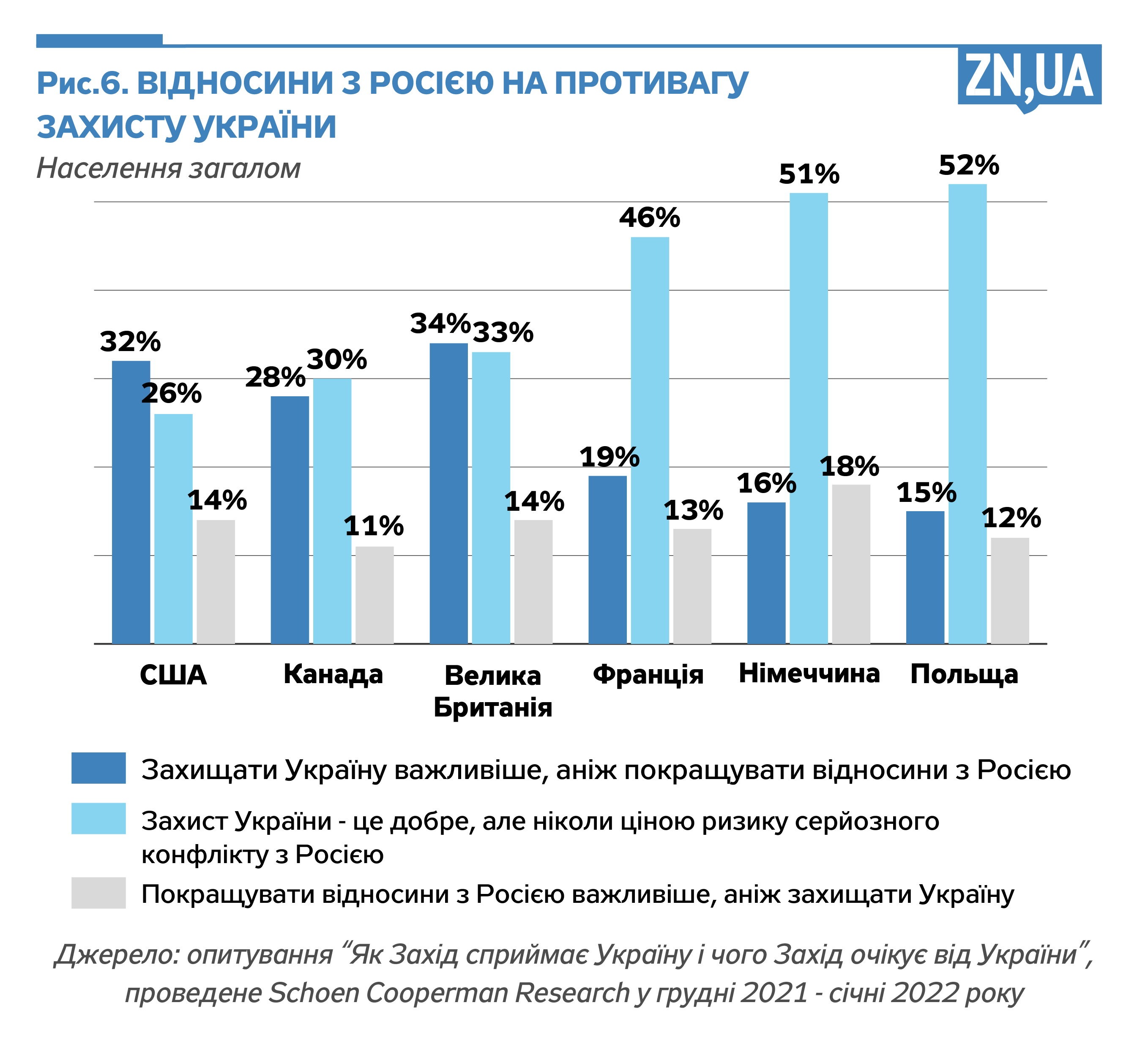 “Не поспішайте радіти й торжествувати, оскільки бажання «західників» захищати Україну різко знижується, коли мова йде про можливість прямого конфлікту з Росією. Особливо це характерно для країн — членів Європейського Союзу: Польщі, Франції та Німеччини. Якщо беззастережно захищати Україну готова приблизно третина англосаксів (зі США, Канади, Британії), то в державах ЄС таких респондентів виявилося менше однієї п'ятої (примітно, що найменше до цього готові поляки — лише 14%). У зазначених країнах Євросоюзу значно популярніша думка, що «захист України — це добре, але тільки не в разі серйозного конфлікту з Росією». Найбільше цієї точки зору дотримуються поляки (52%) та німці (51%)”, - звертає авторка увагу українців.