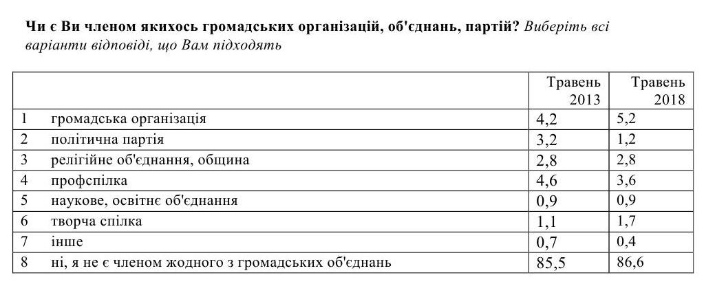 У травні 2018 року 86,6% громадян України не входили до жодної з громадських організацій, об'єднань, політичних партій, свідчать дані опитування фонду "Демократичні ініціативи" та Центру Разумкова.