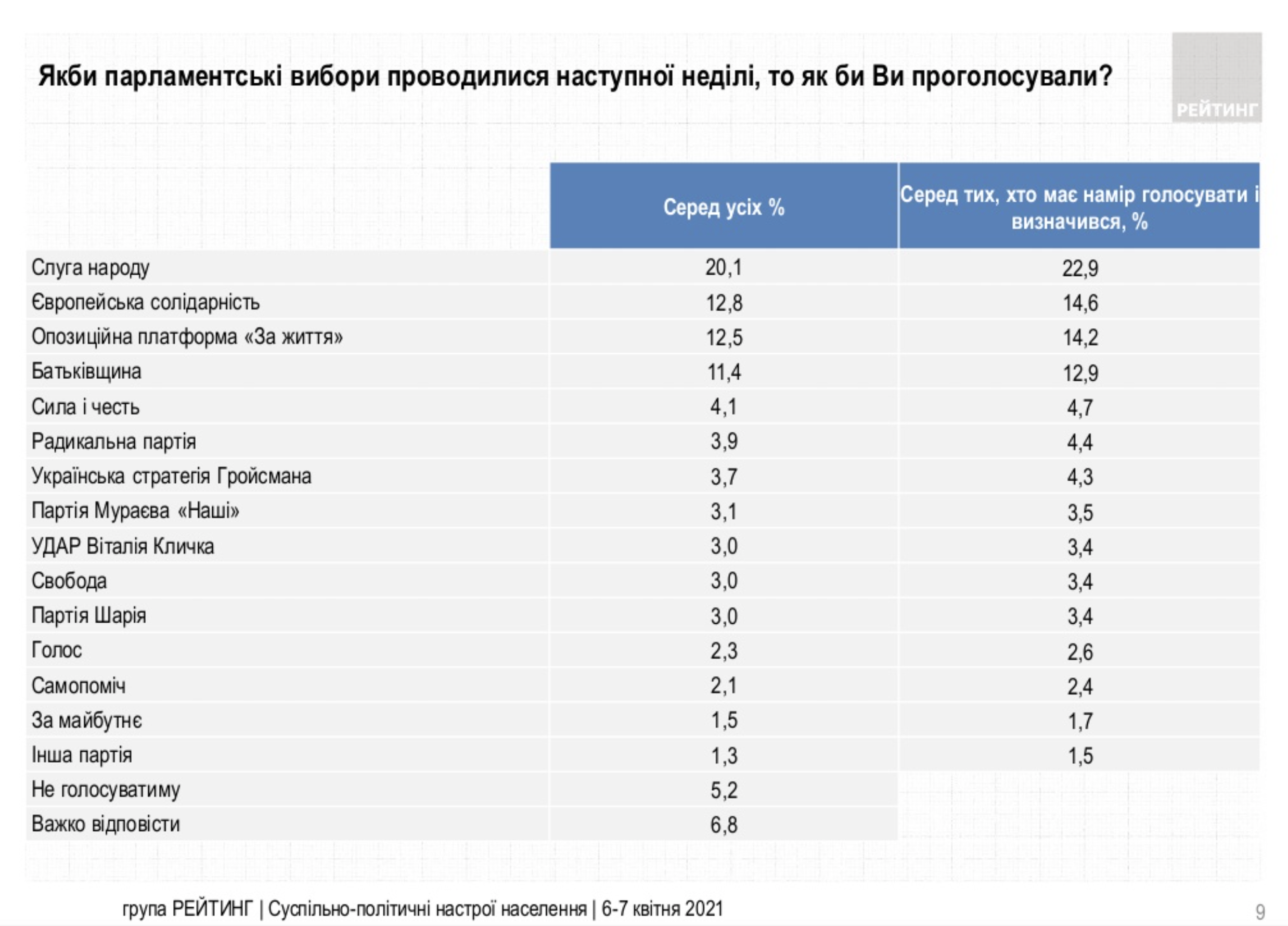 Менше 5% українців, за даними соціологів, проголосували б за партію «Сила і честь» (4,7%), Радикальну партію (4,4%), «Українську стратегію Гройсмана» (4,3%).