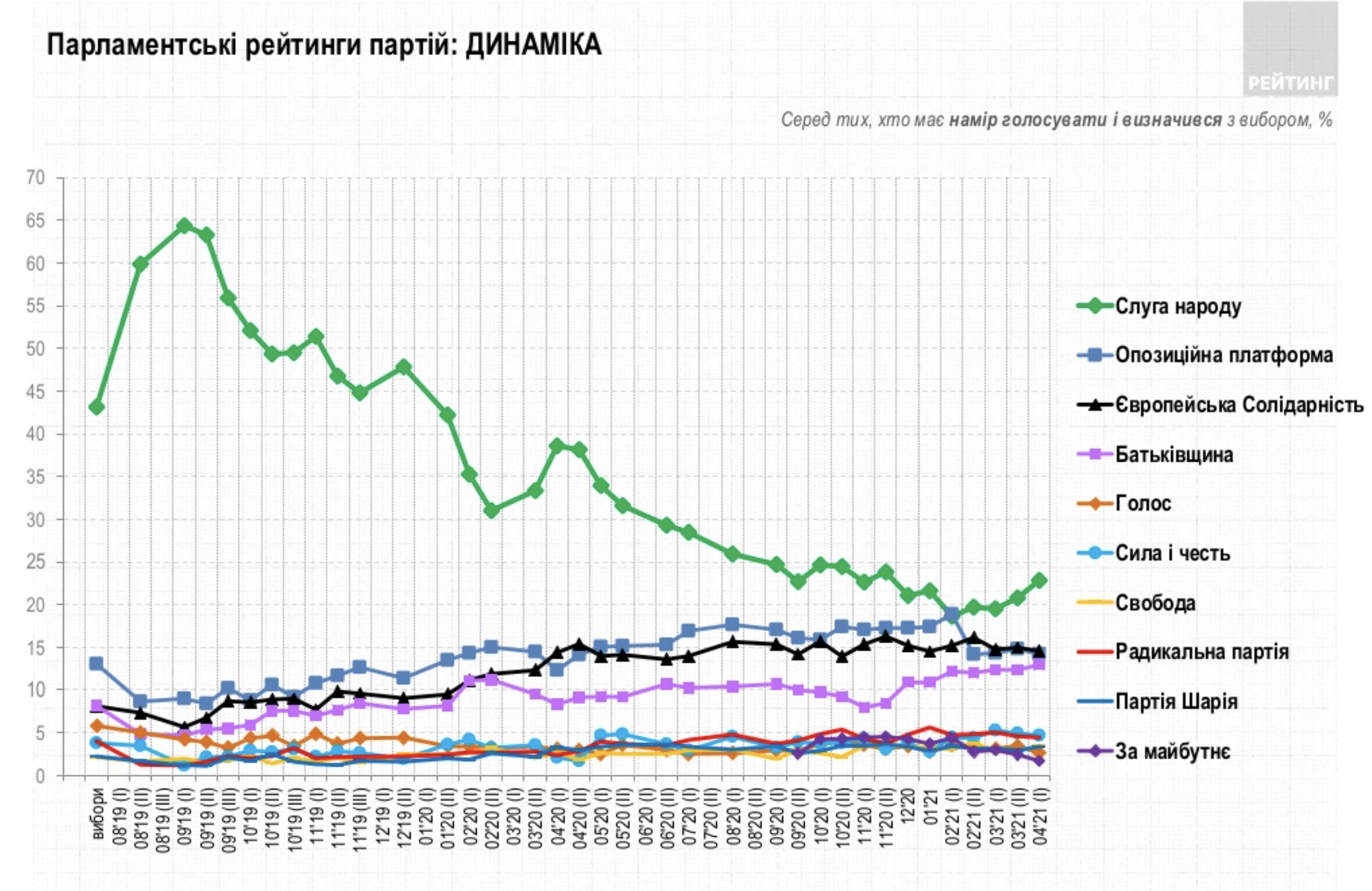 Якби вибори до Верховної Ради України проходили б наступної неділі, то партію «Слуга народу» підтримали б 22,9% тих, хто визначився і має намір проголосувати. Упродовж майже трьох тижнів рівень підтримки партії дещо зріс (однак зміни відбулися в рамках статистичної похибки - 2%). Про це свідчать результати опитування Соціологічної групи "Рейтинг".