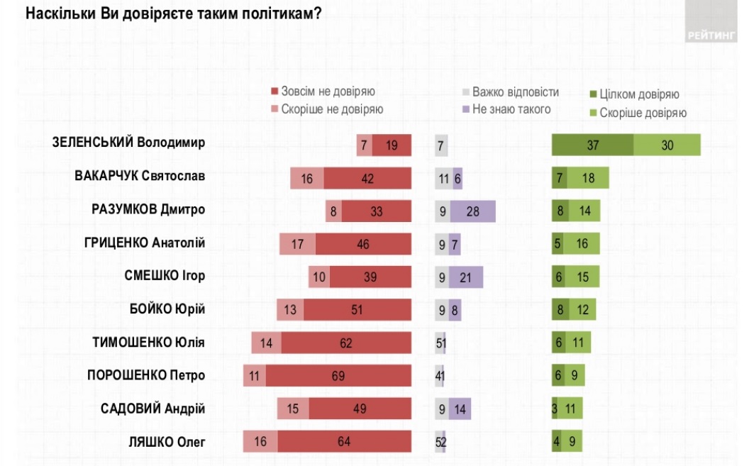 Водночас лідерами недовіри є колишній президент Петро Порошенко та Олег Ляшко, яким не довіряють по 80% опитаних, а також Юлія Тимошенко, якій не довіряють 76%.