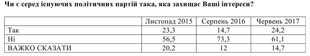 Якщо у серпні 2016 року тільки 15% українців могли назвати партію, що захищає їхні інтереси, то в червні 2017 року таких було вже 24%, а серед тих, хто готовий брати участь у виборах – 34%, свідчать дані опитування фонду "Демократичні ініціативи" і Центра Разумкова.