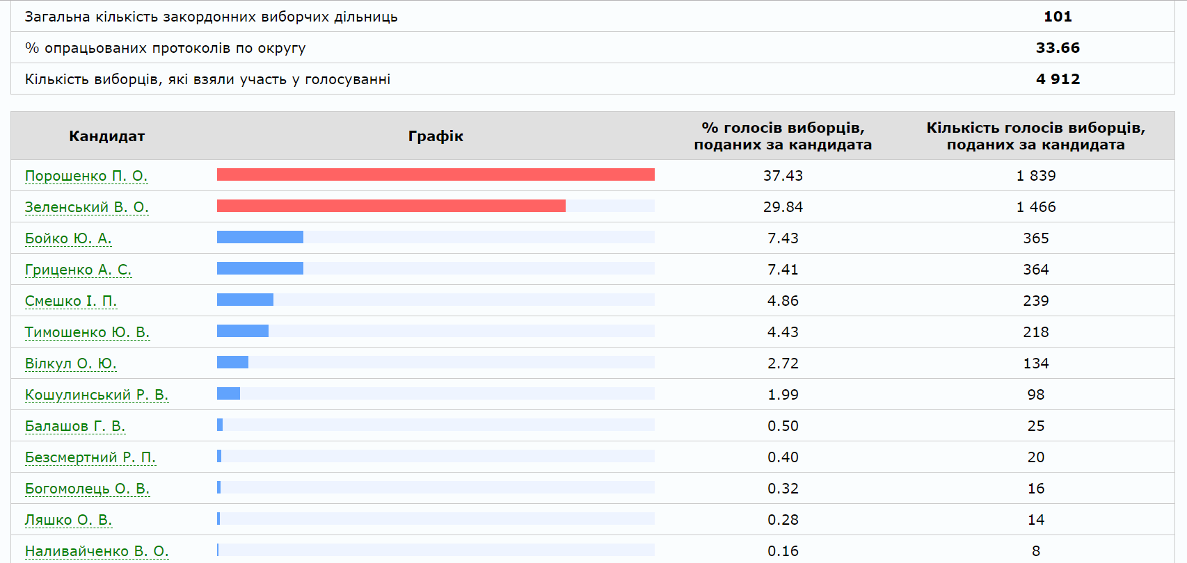 За результатами третини оброблених протоколів, чинний президент України Петро Порошенко набирає 37,43% - за нього проголосували 1839 українців, які проживають за кордоном. Далі слідує Володимир Зеленський з результатом в 29,84%, за якого свої голоси віддали 1466 осіб. Третє місце в закордонному окрузі займає Юрій Бойко (7,43% - 365 осіб).