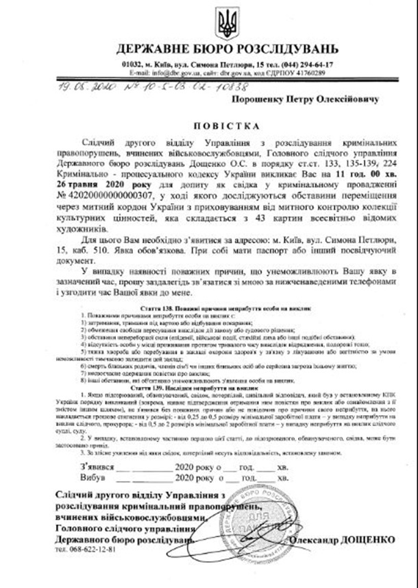 "У зв'язку з цим повідомляємо Порошенка П.О. про необхідність з'явитися до Державного бюро розслідувань об 11:00 26 травня 2020 року на допит у якості свідка", - повідомляє пресслужба.