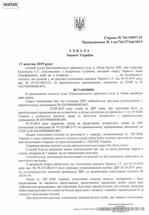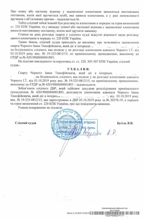 "Сьогодні Шевченківський суд задовольнив скаргу представника потерпілого і зобов'язав розглянути клопотання... Представник потерпілого серед іншого просив наслідок: допитати Портнова Андрія Володимировича; допитати директора Державного бюро розслідувань Трубу Романа Михайловича", - зазначив адвокат.
