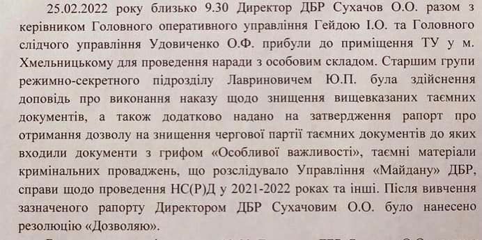 Старший групи режимно-секретного підрозділу Лавринович доповів, які таємні матеріали, на усне розпорядження Сухачова вже знищено, і попросив дозволу на знищення чергової партії.