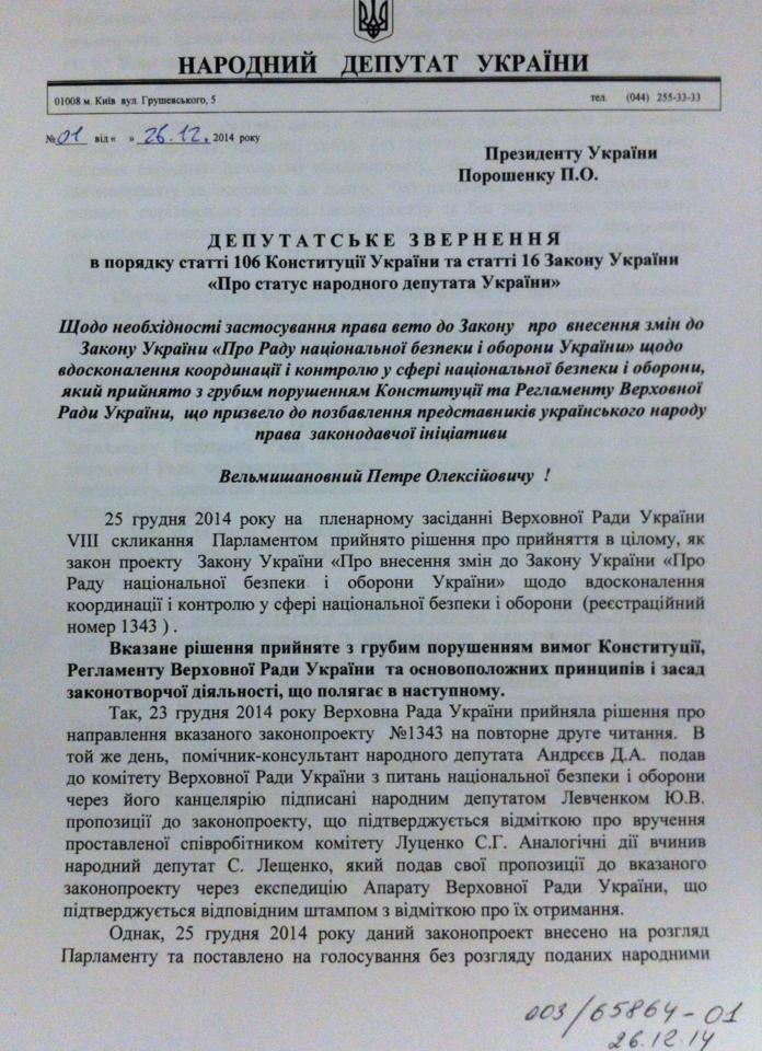 Група народних депутатів висунула вимогу до президента Петра Порошенка накласти вето на Закон про внесення змін у Закон України "Про Раду національної безпеки і оборони".