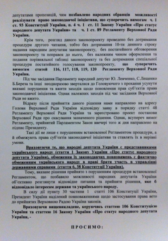 В офіційному зверненні наголошується, що закон "прийнятий з грубим порушенням Конституції та Регламенту Верховної Ради, що призвело до позбавлення представників українського народу права законодавчої ініціативи". Зокрема, депутати вказують на те, що не були розглянуті всі запропоновані поправки до закону. Крім цього, пропонується виключити з ведення РНБО контроль над антикорупційними органами і право рекомендувати керівників силових структур.