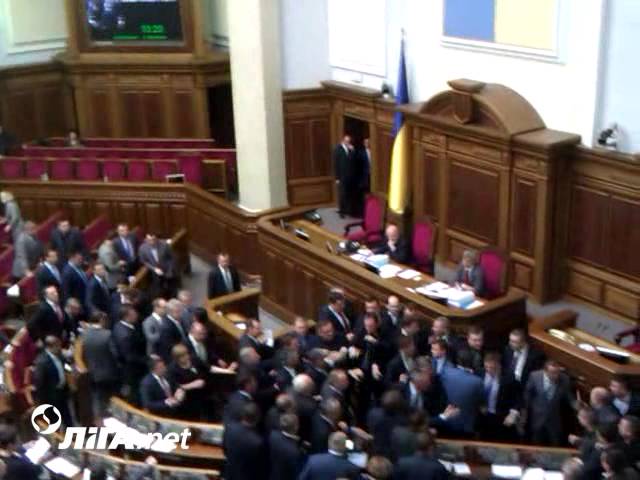 Після цього група народних депутатів від фракції "Свобода", а також низка позафракційних, підійшли до трибуни, почали виштовхувати Симоненка. Вискочили комуністи й інші депутати - у підсумку близько 15 парламентаріїв влаштували бійку. !zn